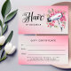 The Hairstylist Modern Watercolor Floral Hairdryer Gift Certificate exudes elegance and charm. The design features trendy script typography with the word "hair," accompanied by a watercolor illustration of a hairdryer and delicate flowers set against a blush ombre pink background. Your name appears in capital lettering on the front for a personalised touch. The back also includes spaces for the recipient's name, the amount, making it a thoughtful and stylish gift option for any occasion. Perfect for hair salons and stylists looking to offer a memorable gifting experience.