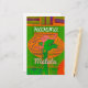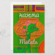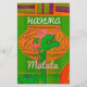 This stylised piece features a bright green giraffe head and neck centrally positioned against a large, decorated orange African pot. An orange shape resembling an elephant's trunk extends from the right side, adding an element of fun and surprise. The background is divided into rectangles of orange, purple, and green, creating a lively patchwork effect. The phrase "HAKUNA MATATA" is prominently displayed in a stylised font, with "Hakuna" above the giraffe's head and "Matata" below.