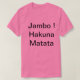 Jambo Hakuna Matata in Kiswahili means " No Problem" is one of the most common word spoken while on a safari in Africa and especially the East coast of Africa. Jambo itself is a greeting in Kiswahili. Many tourist who visit Africa do tend to come across this word Jambo all the time. A sweat and lovely to pronounce many animal safari lovers are always eager to share their hospitality as well by reciprocating with a nice smile while saying these words Jambo and the natives at the same time finish with the words Hakuna matata as well. Having such a beautiful welcoming Tshirt just gets you in the midst of love and the affection to be in such a place where you have a connection. There is no better way to show your appreciation to a language and to learn it even more by associating it with the beautiful continent of Africa where great movies such as the Lion King and many other great songs such as Jambo Jambo Bwana ...Hakuna matata.