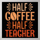 Funny coffee design for the teacher who loves their coffee, features a coffee bean and text that reads Half Coffee Half Teacher! Teacher coffee design mugs, stickers, bags, pillows, T-shirts, and more!