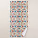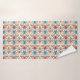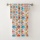 This beautiful geometric design features coral, teal, blue-gray, plum, and tones of sand and yellow, all outlined in black. The colors have a distressed/textured look. This set features the design in a different scale on each towel.