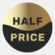 Modern round sticker design featuring а circle divided into two parts, one of which is gold and the other is black. The text is fully customisable.
