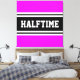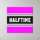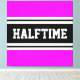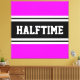 This sporty, athletic design features bold HALFTIME text inside a highlighted wide black stripe with double white racing stripes against bright tropical pink background. The text in this design can be personalised.