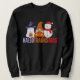 A ghost, a gnome, and a snowman celebrate the holiday season with Hallothanksmas sweatshirt.