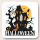 A spooky Halloween scene unfolds with a silhouette of a haunted house against a backdrop of a bright orange moon. The house, with its ominous windows and a ghostly figure floating outside, stands tall and mysterious. Two bare trees, their branches reaching out like skeletal fingers, frame the house, adding to the eerie atmosphere. A carved pumpkin with a sinister grin sits in the foreground, adding a touch of playful horror. The word "HALLOWEEN" is emblazoned across the bottom, complete with spider webs, signifying the holiday's spooky charm.