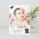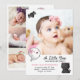 "A Little Boo Has Made Her Debut" pink and white baby girl Halloween-themed birth announcement complete with cute little kawaii ghost with a pink polka dot bow, and cute little kawaii cat and a bat making their appearances as well. Four photos - one large one on front and three small photos on back. Name and birth statistics go on front and there is space for family details and a thank you message on back. Composite design by Holiday Hearts Designs (rights reserved). Template placeholder photos courtesy Unsplash.
