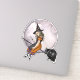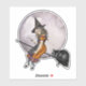 A witchy Alice and her Cheshire Cat fly their broom across the moon for Halloween