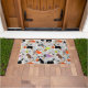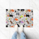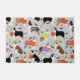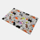 Cute Halloween Australian Shepherd dogs in spooky costumes. Aussie dogs with several coat colours hold trick-or-treat pumpkins, wear witch hats and sweaters with scattered bats, paws and dog bones.