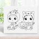 Adorable babies dressed in Halloween costumes. The one on the left is dressed as a dragon. The one on the right is wearing a cat costume with a big bow. A curved pumpkin sits between them and just a little behind. Made for easy colouring.