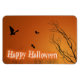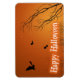 A Halloween silhouette illustration featuring spooky black bats and creepy trees with a drippy "Happy Halloween" Greeting on a mystic orange background.