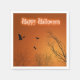 A Halloween silhouette illustration featuring spooky black bats and creepy trees with a drippy "Happy Halloween" Greeting on a mystic orange background.