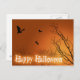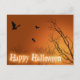 A Halloween silhouette illustration featuring spooky black bats and creepy trees with a drippy "Happy Halloween" Greeting on a mystic orange background.