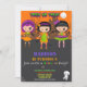 This brightfull and colorfull invitation features Haunted house, three voodoo dolls and two little gosts.