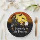 This fun and spooky plate features a cute witch and ghost beside a crooked haunted house. In the background is a full moon with bats and an orange night sky with stars. This is perfect for a Halloween themed birthday party.