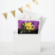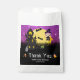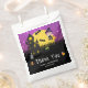 This fun and spooky favour bag features a cute witch beside a crooked haunted house. In the background is a full moon with bats and a purple night sky with stars. The text combines decorative and serif fonts for a stylish and modern look. This is perfect for a Halloween themed birthday party.