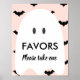 Get ready for a Spooktacular party with this favours sign that features a a cute ghost and a girly pink bat-filled background. The word "favours" is in an easy to read block lettering while the "please take one" is in a modern script.