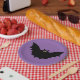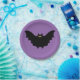Paper Plate printed with Black Bat artwork design image by TheFabricSeal at Zazzle is a cute and simple lone black bat with background colours of Halloween Orange and Halloween Purple illustration drawing silhouette style with peekaboo peering khaki green and pumpkin orange eyes looking out for friends and prey alike and a cool dark Halloween night of adventure, goblins, ghouls and ghosts.
