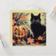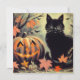 Here's a vintage looking Halloween illustration of a black cat and jack-o'-lantern. Around the cat and jack-o'-lantern are some fall leaves and bare trees. It definitely has spooky pumpkin spice vibes. It's a great Halloween card and is perfect for spooky season greetings, invitations or to accompany a gift.