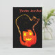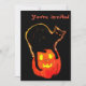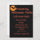 Halloween art black cat glowing with hump atop orange glowing pumpkin on front with orange text You're invited. Back has black background with orange text fill In your own information. Cartoon design.