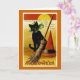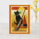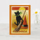 Vintage Halloween greeting card illustration showing a black cat, witches broom and hat with text "Friendly Fairy Witch or Fay, fullfill the wish you wish today."