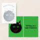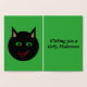 This awesome sleek foil card features a black cat with pointed ears, bright green eyes and a sly red grin. This creepy kitty is perfect for Halloween or for cat lovers.
