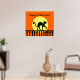 Image is from my original drawing. This spooky black cat with green eyes is walking across the top of a black fence. There is a huge yellow moon against an orange sky in the background. See my store Art by MAR for matching products with this design.