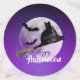 This Halloween confetti features a black cat with a witch hat flying in the night on a witch broom surrounded by bats in front of a full moon and a text saying "Happy Halloween".