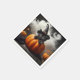 A black kitten wearing a witch hat rests inside a large pumpkin, surrounded by smaller pumpkins and dense, swirling mist