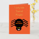 This awesome Foil Halloween card features a spooky black spider with eight hairy legs, yellow eyes with big black pupils and its mouth open showing its fangs. There is orange text that reads “Happy Halloween” and a matching orange background. There is custom text inside so you can personalise this card. The custom text on the front is in beautiful gold foil.