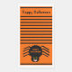 This awesome pack of paper napkins features a spooky black spider with eight hairy legs, yellow eyes with big black pupils and its mouth open showing its fangs. There is orange text that reads “Happy Halloween” and a matching orange background.