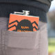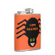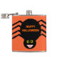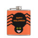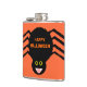 This awesome flask features a spooky black spider with eight hairy legs, yellow eyes with big black pupils and its mouth open showing its fangs. There is orange text that reads “Happy Halloween” and a matching orange background.