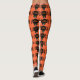 This awesome pair of leggings features a spooky black spider with eight hairy legs, yellow eyes with big black pupils and its mouth open showing its fangs. There is orange text that reads “Happy Halloween” and a matching orange background.