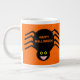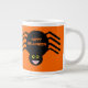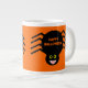 This awesome mug features a spooky black spider with eight hairy legs, yellow eyes with big black pupils and its mouth open showing its fangs. There is orange text that reads “Happy Halloween” and a matching orange background.
