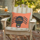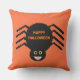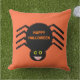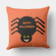 This awesome vibrant outdoor pillow features a spooky black spider with eight hairy legs, yellow eyes with big black pupils and its mouth open showing its fangs. There is orange text that reads “Happy Halloween” and a matching orange background.