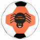 This awesome soccer ball features a spooky black spider with eight hairy legs, yellow eyes with big black pupils and its mouth open showing its fangs. There is orange text that reads “Happy Halloween” and a matching orange background.