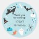 Halloween theme boy's birthday party favour sticker featuring illustration of a ghost, black cat, spider, bat, candies, and pumpkins. The text says "thank you for coming!"