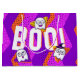 Celebrate a cute and spooky holiday with this Halloween-themed gift bag featuring orange and purple stripes, cute ghost characters, and the word "BOO!" on the front and back. This giftbag is perfect for a Halloween party, birthday, or any occasion to share a Halloween themed gift. Characters are cute, sweet, and sure to bring a smile to any child or adult's face.