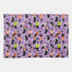 Halloween Border Collie dogs with black and white coats hold trick-or-treat pumpkins, wear witch hats and sweaters with scattered bats, paws and dog bones.