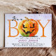 Halloween themed boy baby shower invitation featuring a jack-o-lantern. Back of invite has a black and white striped pattern.