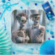 A skeletal bride and groom dressed in wedding attire complete with floral accessories and a top hat set against a misty forest backdrop.