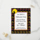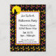 A custom postcard invitation with a background pattern of candy corn, a witch and room for your custom party details in black scripty letters. Click Customise it to change fonts, sizing, text and more, even save your design for later.