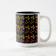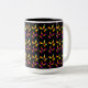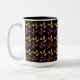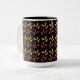 A coffee mug with a colourful pattern of Halloween candy corn in yellow and orange with an orange border on black.