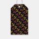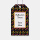 A custom tag with a custom handwritten font and a pattern of Halloween candy corn on the front, and the back.