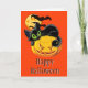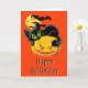 Greeting card shown with a festive Halloween cat on a pumpkin print.