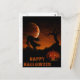 A dark yet friendly Halloween card with a jack-o-lantern in the foregrounds and a scarecrow swaying in the breeze in the back.