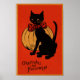 A black cat wearing a polka dot bow and a big pumpkin on an orange background from a vintage Halloween postcard from 1912.
