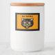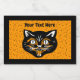 This custom label for a food jar has the face of a black Halloween cat with open mouth and orange and white accents on an orange background with little black stars and a black border. Customise your text with the template.