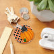 Colourful Halloween t-shirts, mugs, cards, stickers, trick or treat bags, magnets, and other Halloween clothing and gifts with a cute black cat in pumpkin and colourful orange and black dots design!