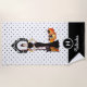 Designed by Farida Greenfield. A fashion illustration of a lady wearing gorgeous classic elegant long black dress holding a witch broom decorated with black ribbons with pumpkins on the foreground and black and white polka dots pattern on the background. It has customisable monogram initial and name on the lower side. Perfect design with Halloween theme.