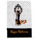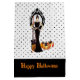 Designed by Farida Greenfield. A fashion illustration of a lady wearing gorgeous classic elegant long black dress holding a witch broom decorated with black ribbons with pumpkins on the foreground and black and white polka dots pattern on the background. It has customisable text on the lower side. Perfect design with Halloween theme.